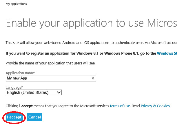 Click "Create application" link. In the following dialog, provide a Name for your application and submit byt clicking "I accept" button.